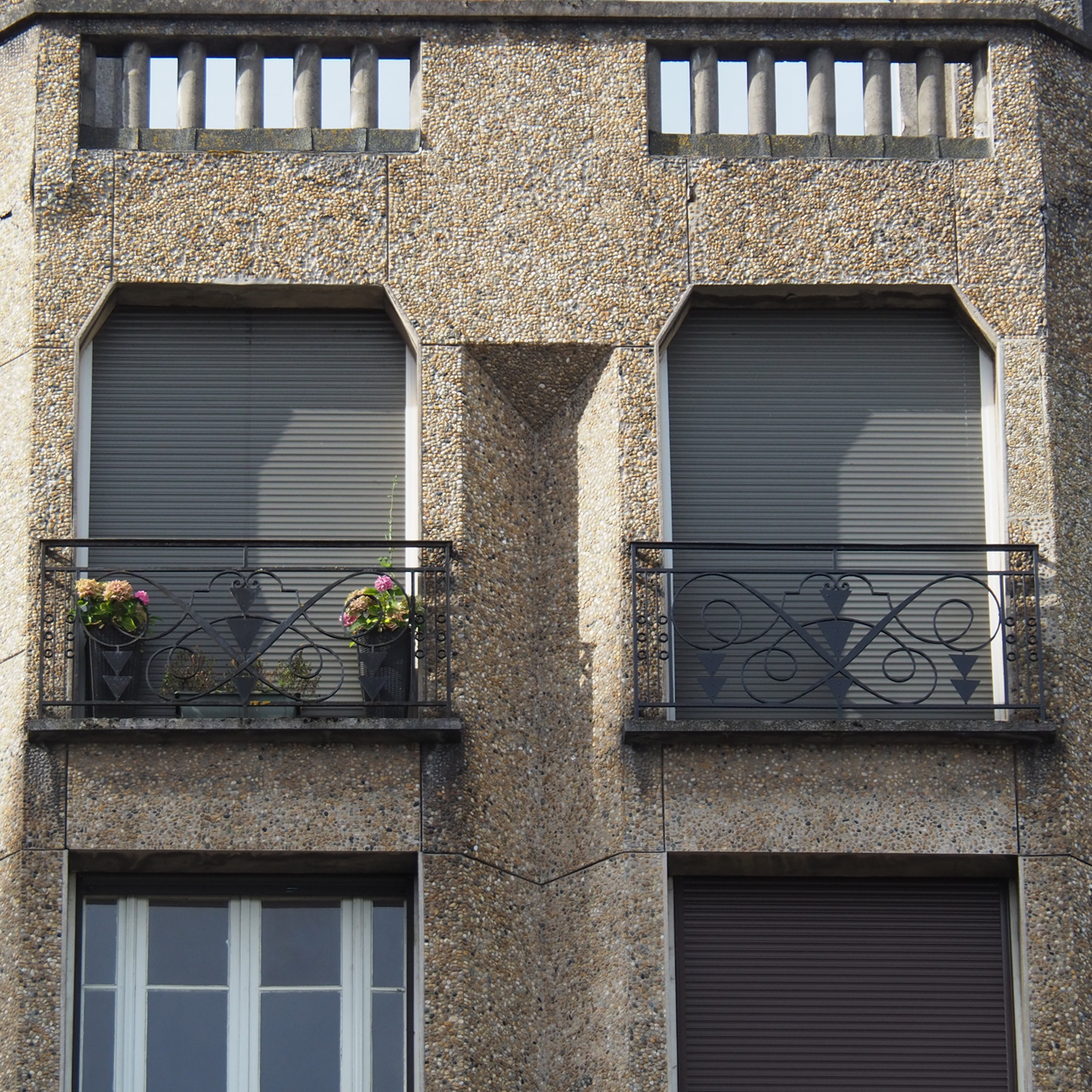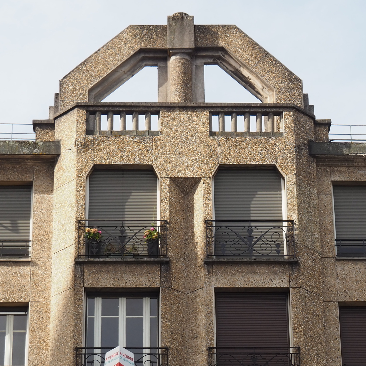 Le bâtiment, dont il est question ici, présente la particularité d’une ossature en béton armé, totalement dissimulée par le revêtement formant esthétiquement des dalles de petits galets, fréquent en région parisienne mais unique à Rodez.